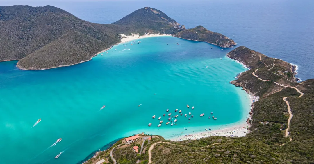 Vista aérea de la Playa del Forno en Arraial do Cabo, con sus aguas turquesas y verde esmeralda, arena blanca y botes anclados en la ensenada, rodeada de colinas con vegetación baja, en el estado de Río de Janeiro, Brasil.