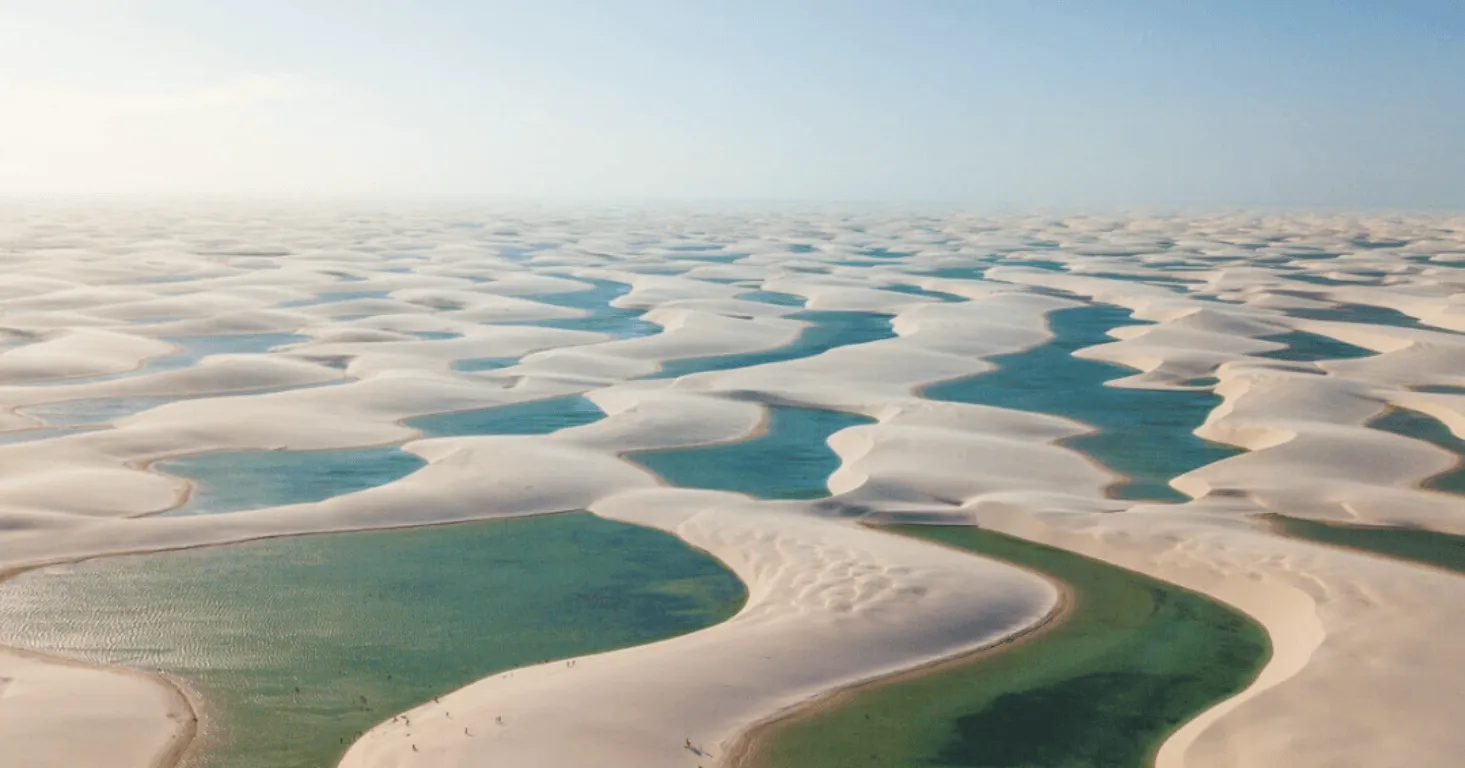 Vista aérea de las dunas blancas de los Lençóis Maranhenses con lagunas de aguas turquesas y verdosas entre las ondulaciones de arena, en Maranhão, Brasil.