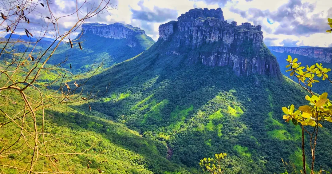 View of the imposing Morro do Castelo with its distinctive flat-topped shape rising above the lush green forest of Chapada Diamantina, under a partly cloudy sky, in Bahia, Brazil.